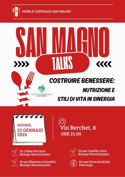 La Contrada San Magno guarda al futuro e inaugura per il 2026 un nuovo e stimolante format di incontri: “San Magno Talks”, un ciclo di appuntamenti divulgativi pensato per creare uno spazio di confronto, dialogo e crescita aperto a tutta la cittadinanza, contradaioli e non.